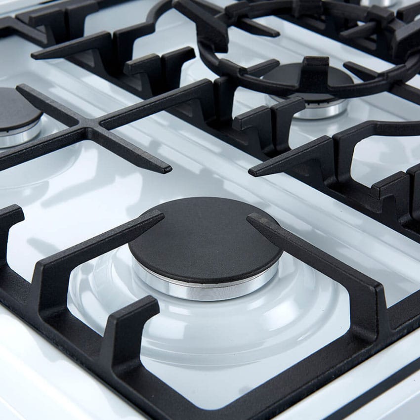 - Continuous cast iron grates ensure stability and mobility for cookware both on and off the heat source.